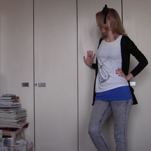Tag 77 (21.9.2010): Haarschleife selbstgemacht von meiner Mutter, Ohrringe SIX, Stimmungsring unbekannt, Strickjacke Pimkie, Top + T-shirt + Jeans H&M