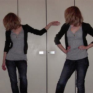 Tag 219 (09.02.2011): Strickjacke H&M, T-shirt Gina Tricot, Jeans Mister*Lady, Uhr Fossil, Sternenringohrring unbekannt