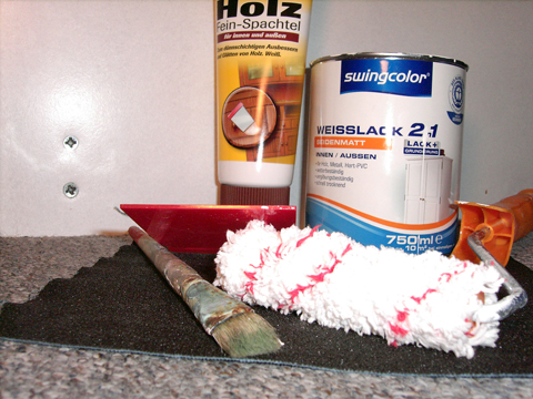 Was braucht man? Möbelstück zum streichen (ach ne…), Lack (ich hab 2:1 Acryllack genommen, weil der wenig riecht, für innen ausreicht, schnell trocknet und man nicht noch zusätzlich Lack für den Voranstrich braucht + da er auf Wasserbasis ist lässt er sich gut von Händen und Kleidung entfernen), eine Streichrolle (je nach Größe der Fläche variiert auch die Größe der Rolle), Borstenpinsel (für Ecken und Kanten, die schlecht zugänglich sind), Schmirgelpapier (relativ fein, nicht zu grob, da man sonst das Holz verkratzt) und eventuell Holzspachtelmasse und einen Spachtel + Werkzeug