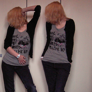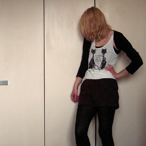 Tag 280 (11.04.2011): Strickjacke, Rock, T-shirt (selbstbedruckt) und Mütze H&M, Strumpfhose C&A, Uhr Fossil