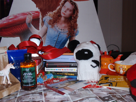 Alice im Wunderland Pappaufsteller, Duschzeug (yeaah Fuzzy Peach vom Body Shop ♥), Schokolade, Pralinen, Schokolade, Minitaschenlampe, Bücher & DVDs, Pandamütze, Teeservice von Mila und Tee, Hausschuhe für die Mikrowelle (die kann man aufheizen kann!!!), H&M Gutschein, Eintrittskarten für das Schokoladenmuseum in Köln und eine silberne Schneeflocke für mein Sammelarmband.