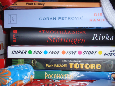 Büch über das Werk von Walt Disney, Die Villa am Rande der Zeit, Atmosphärische Störungen, Super Sad True Love Story, Mein Nachbar Totoro und Pocahontas.
