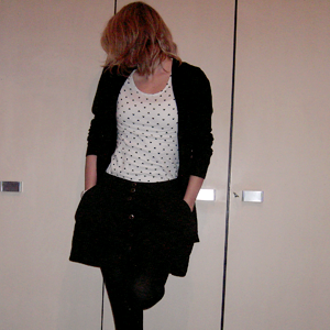 Tag 240 (02.03.2011): Strickjacke H&M, T-shirt Colosseum, Rock Zara, Strumpfhose C&A, Kette vintage (von meiner Großmutter)