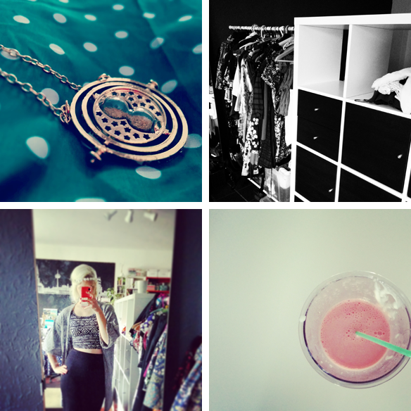 In London habe ich diese wundervolle Zeitumkehrerkette und ein süßes Pünktchenkleid gekauft, meinen hässlichen Kleiderschrank rausgeworfen und stattdessen ein Kallax-Regal und eine Kleiderstange aufgebaut, Hippiechic getragen und Melonensmoothie getrunken.