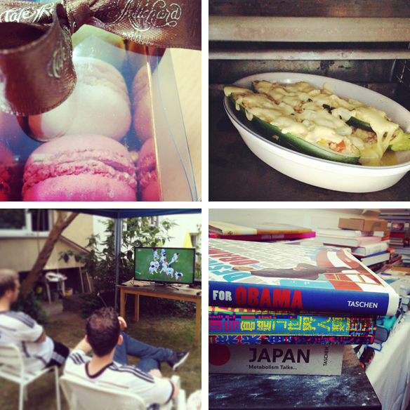 Leckere Macarons in meiner Lieblingsbäckerei gekauft, gefüllte Zucchini gemacht, Fußball-WM geguckt und beim Taschensale zu viele Bücher gekauft.