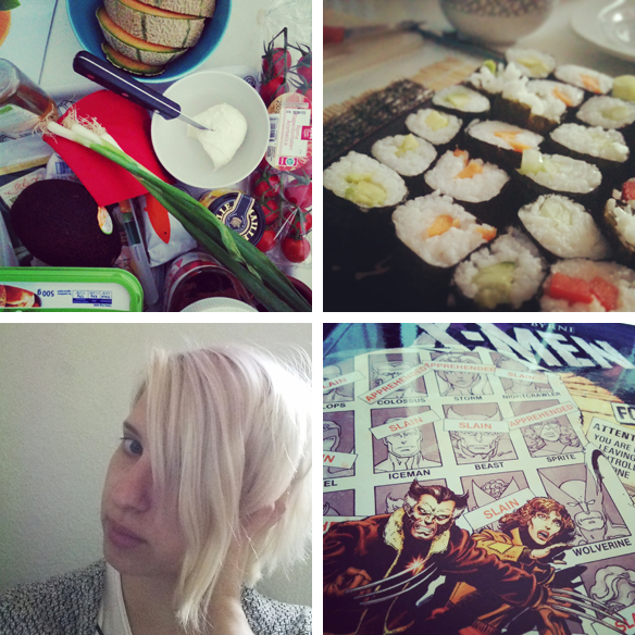 Riesiges Frühstück gehabt, Sushi selber gemacht, meine Haare helllila gemacht und mir den X-Men days of future past-Comic geholt (sooooo spannend *-*).