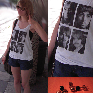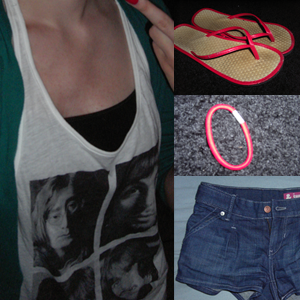 Tag 10: Shorts, schwarzes Top, Beatles Top und Strickjacke von H&M, Nagellack MNY, Haargummi und Flip-Flops in kleinen Billigläden gefunden