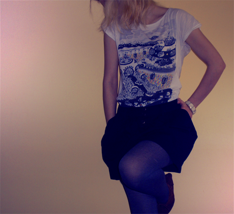 Und um in meiner Kleidung etwas Frühlingshaftigkeit zu verpassen, habe ich ganz tief in meiner Schmuckkiste gewühlt um etwas zu finden, was ich schon lange nicht mehr getragen habe. Und siehe da, sehr schöner, alter Schmuck ist zu Tage gekommen. Der Armreifen (Messing und Perlmutt) gehörte meiner Mutter, als sie im Teenager Alter war. Die Ohrstecker (aus Bernstein :3) hab ich irgendwann bekommen, als ich im Kindergarten war. Mit den neuen Schuhen und Kleidung sieht das ganze dann so aus: