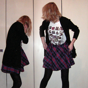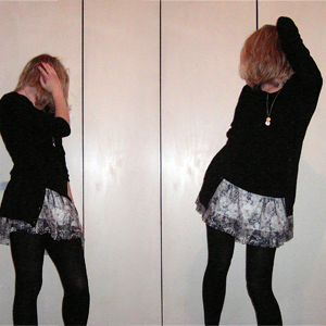 Tag 240 (02.03.2011): Strickjacke H&M, T-shirt Colosseum, Rock Zara, Strumpfhose C&A, Kette vintage (von meiner Großmutter)