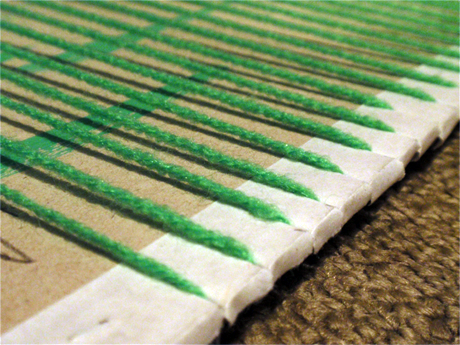 Einen Webrahmen könnt ihr übrigens sehr leicht selber machen. Nehmt einfach ein Stück Pappe, welches größer ist, als das fertige Stück Stoff sein soll. Schneidet an zwei gegenüberliegenden Kanten kleine Schlitze in Rahmen. Am besten im Abstand von einem Zentimeter. Spannt nun zwischen den Schlitzen Fäden. Die Fäden sollten ca 10 Zentimeter länger sein als das Brett. Klebt nun die Fäden auf der Rückseite eures „Rahmens“ fest.