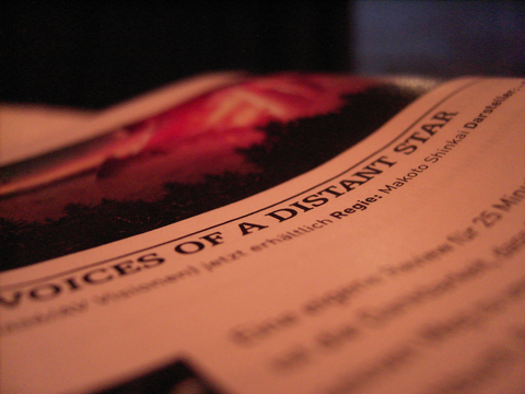Der Film Voices of a distant star, 2003, erzählt hingegen eine vollkommen andere Geschichte. Auch hier thematisiert Shinkai Beziehungen. Wie lange ist Etwas noch eine Freundschaft und wann ist es Liebe? Wie weit können Menschen voneinander entfernt sein ohne sich aus den Augen zu verlieren? Diese Fragen müssen sich die Protagonisten Nagamine und Noboru stellen, die in der nahen Zukunft leben. Die Menschheit hat ihre Technik schnell weiterentwickelt und kann nun mit Mechas (große Kampfmaschine oder auch Raumschiffe, in Menschen oder Tierform in welchen Menschen sitzen und sie von dort aus lenken) durch das Universum fliegen. Nach einigen Kriegen rund um den Mars dringen die Menschen immer weiter an den Rand des Sonnensystems vor. Nagamine wird ausgesucht um in einem der Raumschiffe die Erde zu verteidigen. Per Handy tauscht sie auf ihrer Reise Nachrichten mit ihrem Schulfreund Noboru aus. Leider brauchen die Nachrichten immer länger um die Erde zu erreichen. So sind es anfangs nur Stunden, dann Tage, Wochen, Monate und schließlich Jahre…