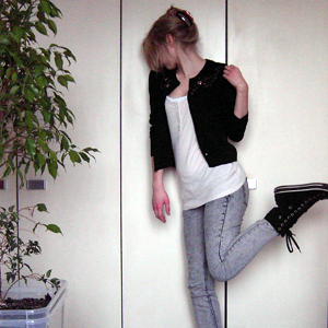 Tag 225 (15.02.2011): Haarspange, Tank-Top, Top und Jeans H&M; Strickjacke unbekannt; Schuhe Convers; Baum Ficus Benjamini (Liebe!)