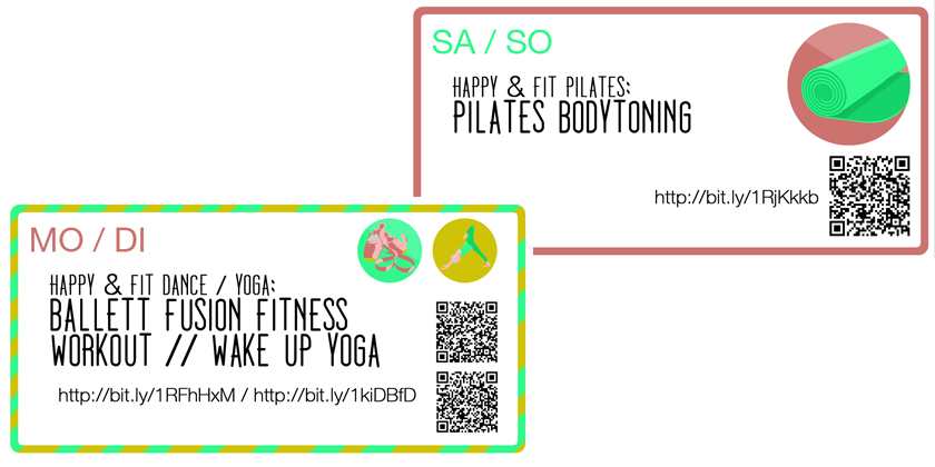 2. Jeweils Montags oder Dienstags, Donnerstags oder Freitags und Samstags oder Sonntags ziehst du zufällig eine der Karten für einen dieser Wochentage. Die Karte nennt dir die URL (als Link und QR-Code) zu einem Happy & Fit Sportvideo, welches eine 10-25 minütige Sportaufgabe bereithält.