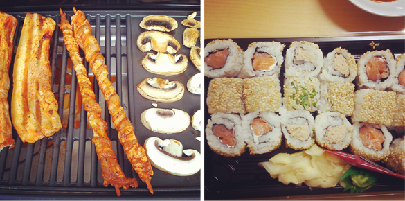 Links zwei Sushiplatten aus dem Okinii und rechts das Menü aus Onigiri und Miso-Suppe vom Wakaru.
